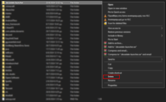 2. Locate the .devastate-launcher folder, then right-click on it and select Delete.